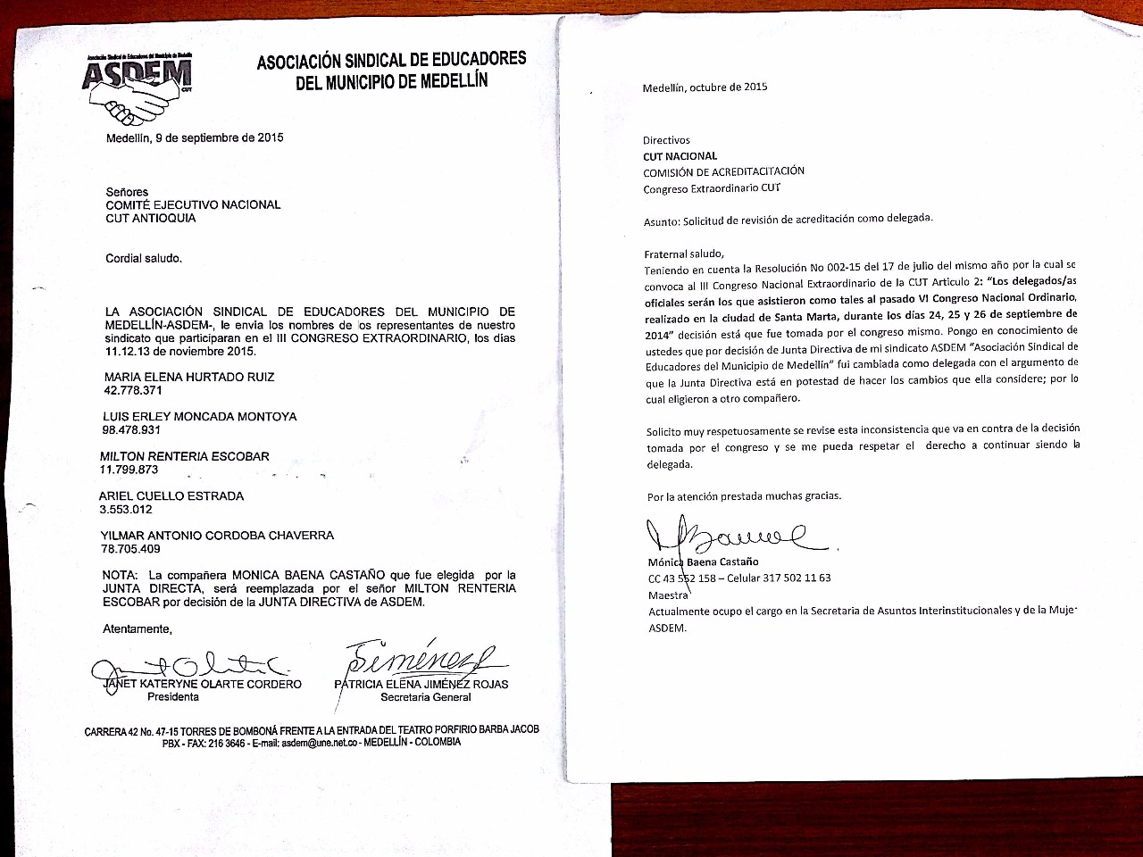 Congreso CUT. Ante el Congreso de la CUT radicamos propuestas concretas para la clase trabajadora, la mujer y la juventud, y no se me permitió la continuidad en dicho congreso, por tener filiación politica distinta a la de la mayoría de la junta directiva.