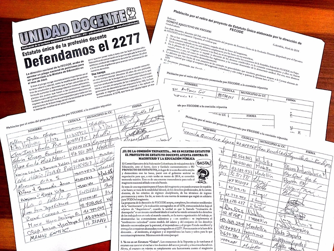 Defensa del estatuto 2277. He defendido el estatuto del 2277 por su régimen especial, la estabilidad laboral y su forma de ascenso sencilla y accesible, que al llegar a la categoría 14 sigan ascendiendo hasta su jubilación y que al jubilarse su pensión no pierda el poder adquisitivo con los años, promover los cursos para el ascenso de estos maestros y recogimos firmas solicitando el retiro de la propuesta de estatuto único propuesto por la dirección de Fecode ya que deroga el estatuto 2277, acaba la estabilidad laboral y somete a todos los maestros a la evaluación como mecanismo de sometimiento.