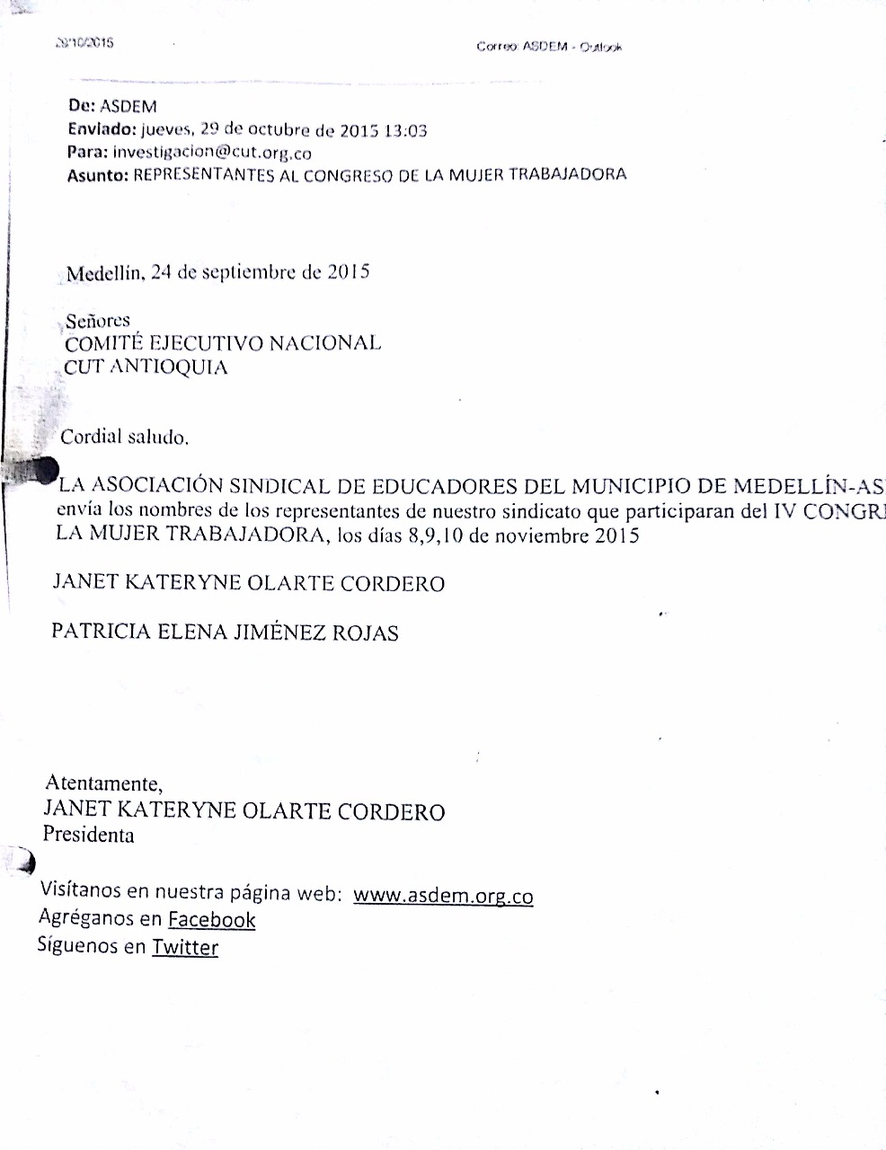 Mujer Delegadas CUT. Yo Mónica Baena C pertenciente a la Secretaría de la Mujer ASDEM no se me permitió asistir al Congreso de la Mujer apesar que fuí la unica de la junta con propuesta oficial y radicada ante la CUT.
